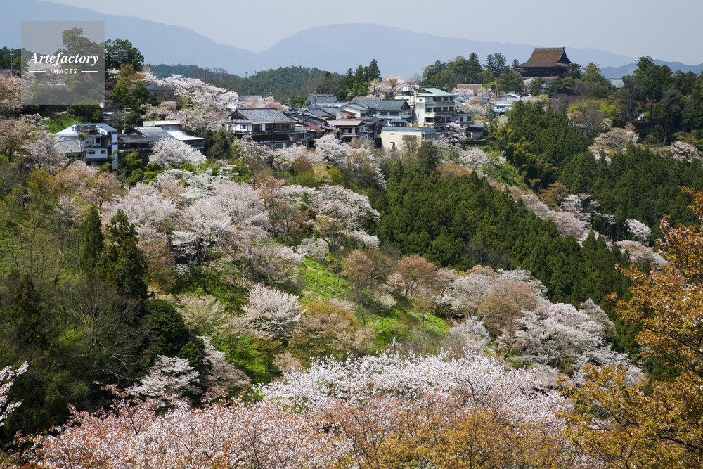 作品タイトル     シロヤマザクラ咲く吉野山から蔵王堂 モデルリリース なし