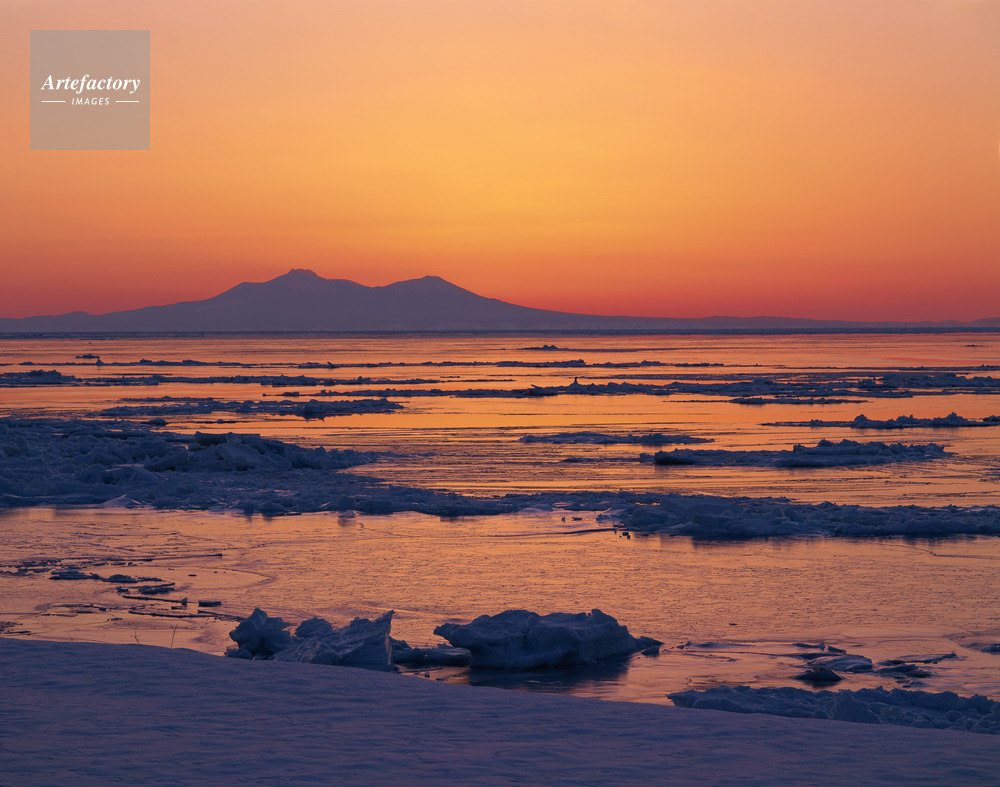 | 作品タイトル | 黎明に染まる流氷と国後島羅臼山 | モデルリリース | なし | |