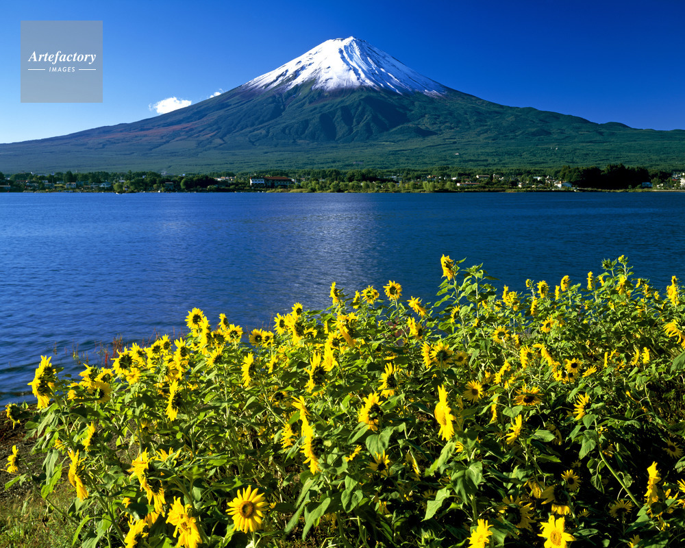 | 作品タイトル | ヒマワリ咲く河口湖湖畔から富士山初冠雪 | モデルリリース | なし | |