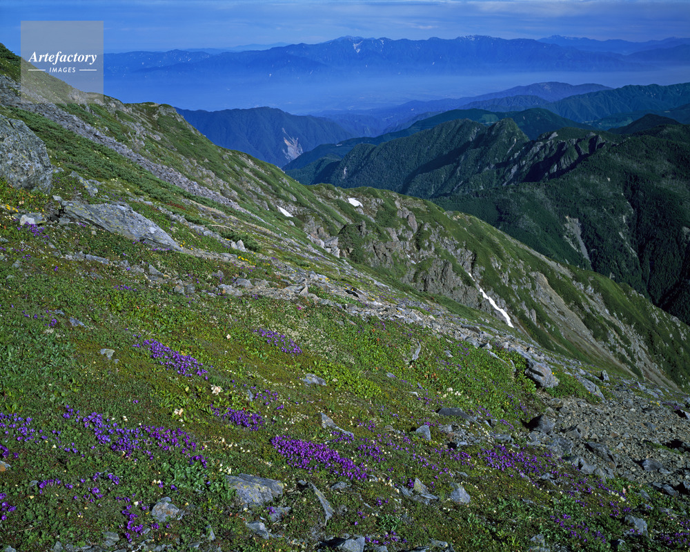 | 作品タイトル | オヤマノエンドウ咲く前岳(荒川岳)から中央アルプス。南アルプス | モデルリリース | なし | |