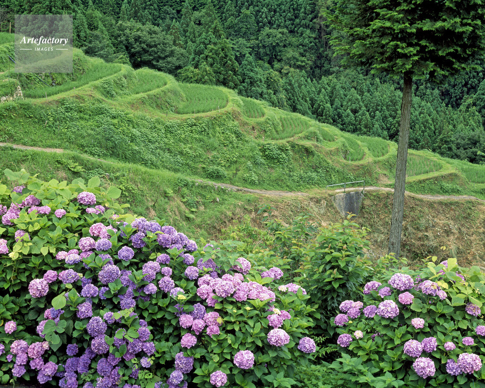 作品タイトル     アジサイ咲く丸山千枚田 棚田百選 モデルリリース なし