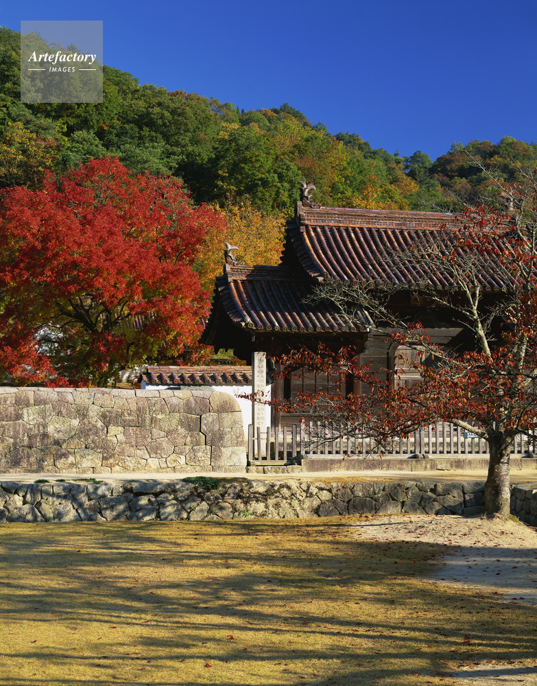 作品タイトル     校門と石塀と紅葉の楷の木。旧閑谷学校 モデルリリース なし