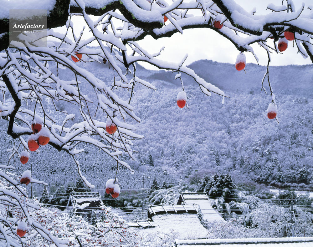 | 作品タイトル | 柿と茅葺き民家 雪景 | モデルリリース | なし | |