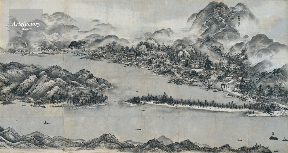 | キャプション | 紙本墨画淡彩,1幅, 画面に作者を明示するような落款・印章の類はないものの、全体の筆法や構図、図中に書き込まれた地名の文字の書体などから、雪舟(1420~1506頃)筆とみなされている作品である。 図にはほぼ中央に天橋立の白砂青松と智恩寺が表され、その上方に阿蘇海をはさんで寺社の林立する府中の町並み、さらにその背後には巨大な山塊と成相寺の伽藍が配されている。一方、橋立の下方には宮津湾がひろがり、またそれを囲むように栗田(くんだ)半島の山並みがその下端になだらかに横たわっている。広大な空間を感じさせる、開放感たっぷりの構成である (..) | 制限事項 | ||