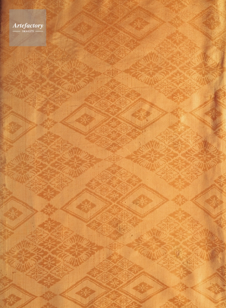 | キャプション | 淡紅幸菱文固綾,1領, 典型的な女性用の単で、淡い紅地に吉祥文の一種である幸菱(さいわいびし)を織り出した固綾(あたあや)が用いられている。単は肌着で紅色が多く好まれたが、季節や重ねの色の取り合わせによって異なる色のものも使用された。 | 制限事項 | ||