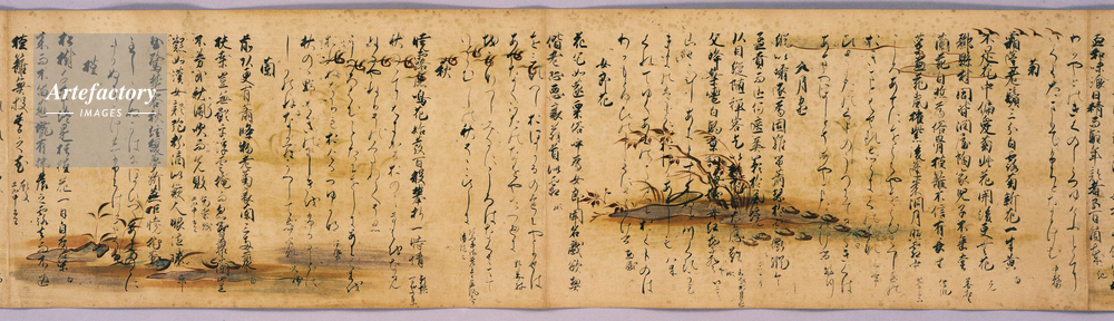 | キャプション | 紙本墨書,2巻, 芦手絵を描いた料紙に『和漢朗詠集』を書写したもので、下巻に「永暦元年四月四日、右筆黷之、司農少卿伊行」という奥書があり、永暦元年(1160)に藤原行成(972~1027)の五代の孫世尊寺伊行によって書写されたものであることがわかる。伊行は能書家として知られ、書道の秘伝書『夜鶴庭訓抄』を著したことでも知られる。 芦手絵とは、平安時代後期に流行した「芦手」と呼ばれた文字を取り込んだ絵のこと。芦・鳥・水流などさまざまな景物(四季の風物)のなかに、文字を絵画化して書き混ぜた「芦手」の意匠は、衣装や家具など多分野に (..) | 制限事項 | ||