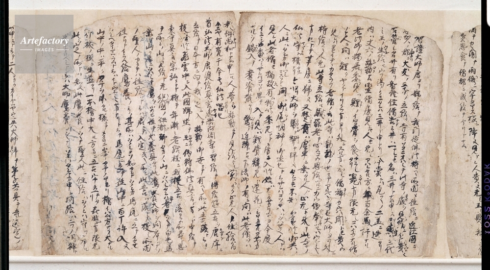 | キャプション | 紙本墨書,1巻 縦 30.2 cm 横 25.5 cm 総長 850.0 cm, 仏教説話集『打聞集(うちききしゅう)』の古写本。もと二帖または三帖であったと推定されるが、今は下帖だけが残る。表紙に署名した栄源は、この本の所持者であり、またこれを書写した筆者とも思われる。書写の時期は、紙背文書の年記等より長承三年(1134)頃と考えられる。紙背文書は大半が比叡山延暦寺に関わるものである。 | 制限事項 | ||