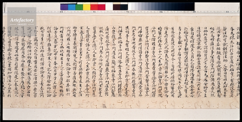 | キャプション | 紙本墨書,1巻 縦 28.0 cm 横 719.0 cm, 三蔵法師玄奘(げんじょう)の生涯が最も詳しく、かつ正確に記述された伝記。全体十巻のうち、前半の五巻は、出生から西域・インドより帰国するまでが、後半の五巻は、帰国後の訳経活動から遷化(せんげ)に至る事跡が記されている。 巻首に「高山寺」の朱方印があるが、法隆寺本(重文)の僚巻と認められる一巻。 |