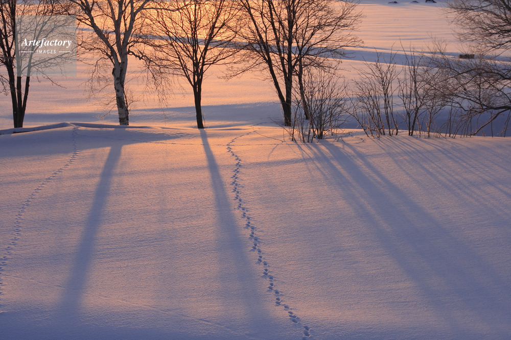 | キャプション | 朝の雪原の樹の影とキタキツネの足跡 | 制限事項 | ||