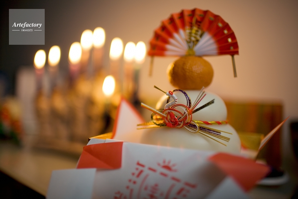 | キャプション | Ceremonial Japanese New Year tangerine and mochi mix with a menorah lighting the last night of Hanukkah. | 制限事項 | ||