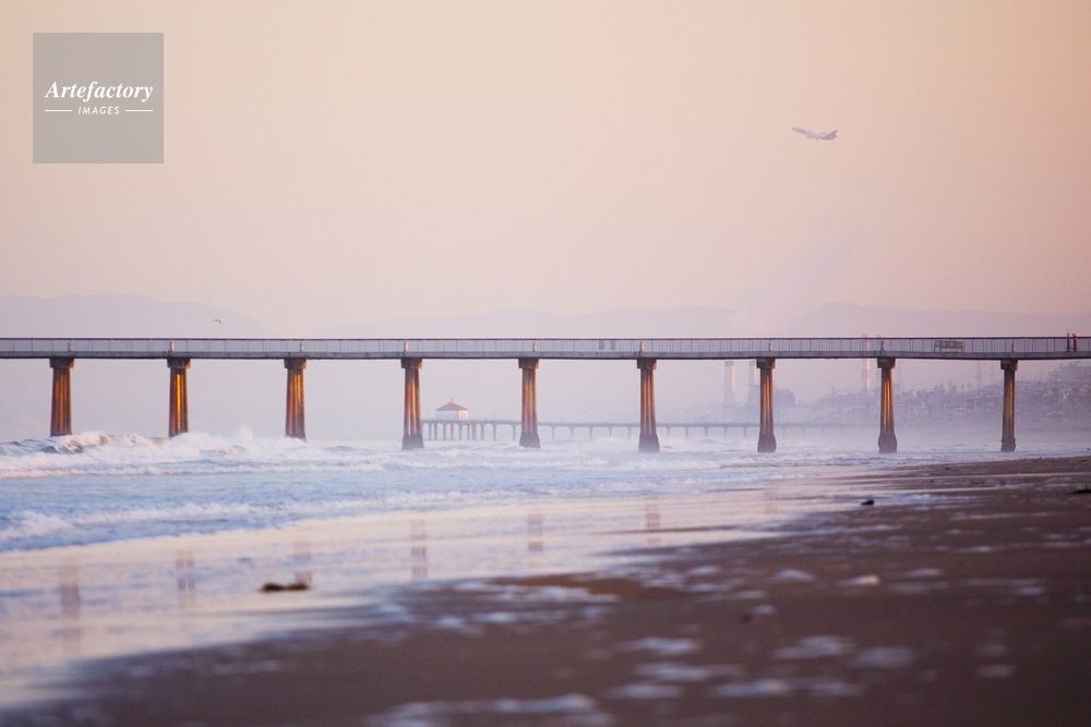 | キャプション | Looking north this morning from 5th St. in Hermosa Beach, through the Hermosa and Manhattan Piers and a plane taking off from LAX. | 制限事項 | ||