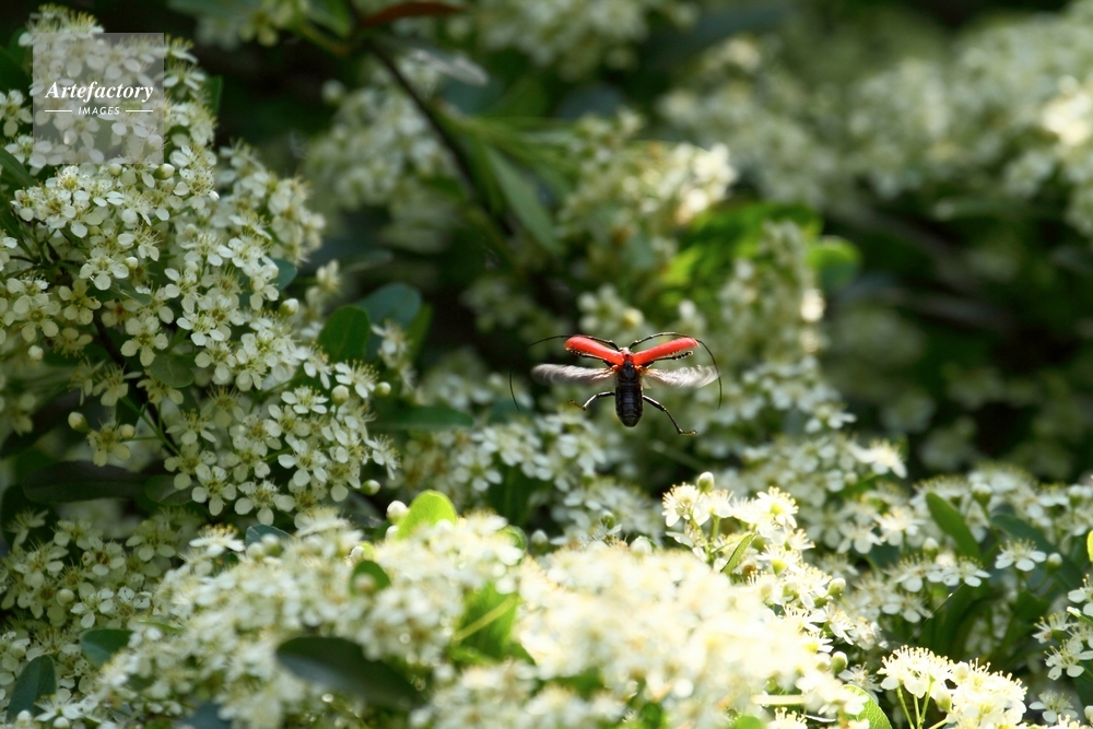 | 作品タイトル | ピラカンサにきたベニカミキリ、飛翔 | モデルリリース | なし | |