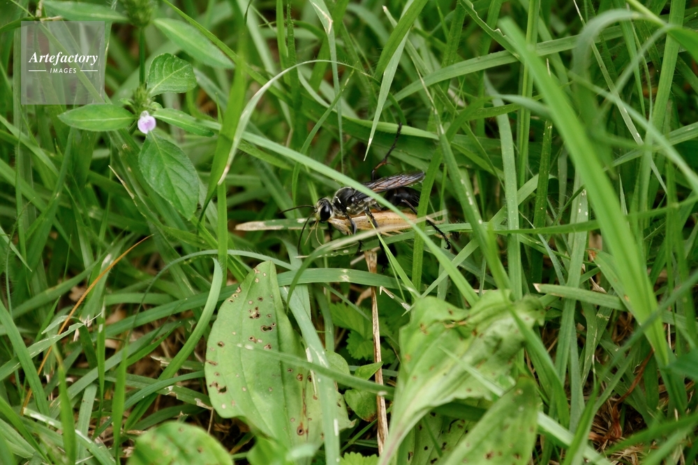 作品タイトル     バッタ(キリギリス類)を巣に運ぶクロアナバチ モデルリリース なし