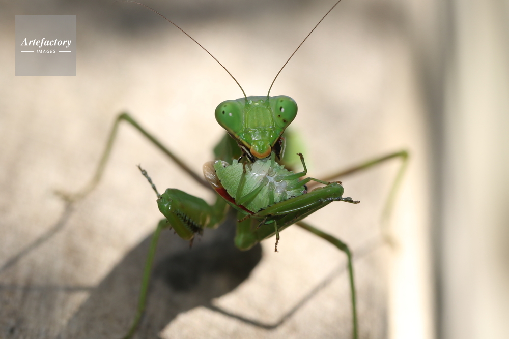 | 作品タイトル | 捕まえたカメムシ(チャバネアオカメムシ)を食べるハラビロカマキリ | モデルリリース | なし | |