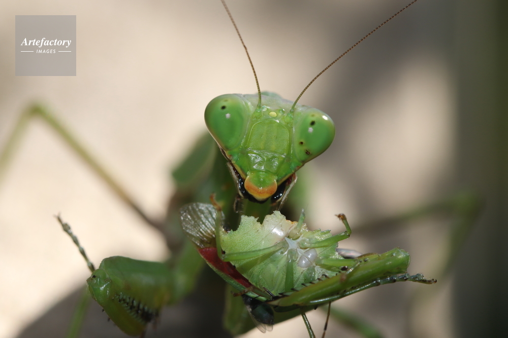 | 作品タイトル | 捕まえたカメムシ(チャバネアオカメムシ)を食べるハラビロカマキリ | モデルリリース | なし | |