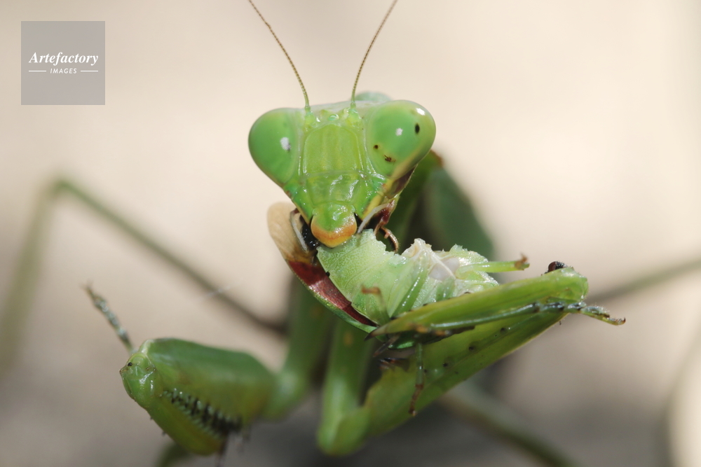 | 作品タイトル | 捕まえたカメムシ(チャバネアオカメムシ)を食べるハラビロカマキリ | モデルリリース | なし | |