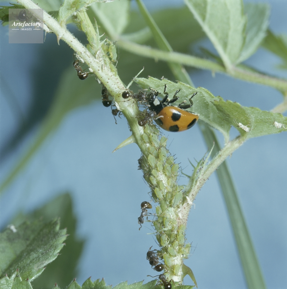 | 作品タイトル | ナナホシテントウ・アミメアリに追い払われる(アリマキ) | モデルリリース | なし | |