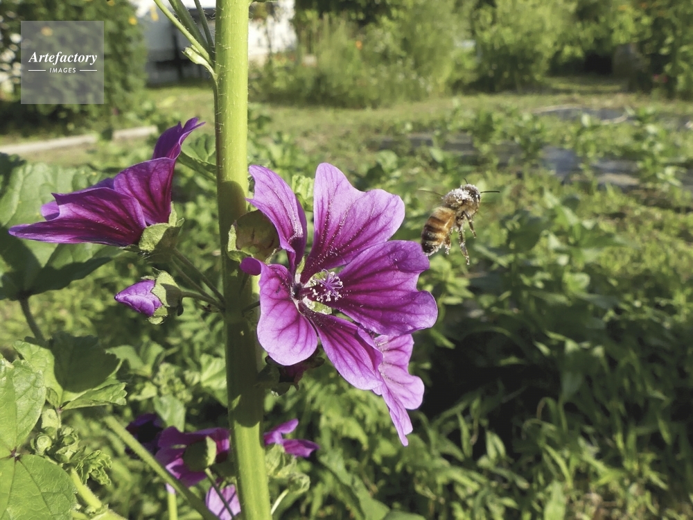 | キャプション | ゼニアオイの花粉を体中につけて飛び立つ ミツバチ科 | 制限事項 | ||