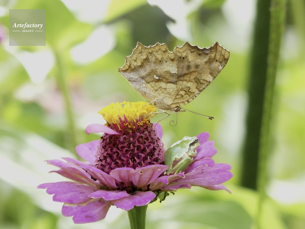 | キャプション | ヒャクニチソウ吸蜜(キタテハ)・花上で休む(アマガエル) アマガエル科 | 制限事項 | ||