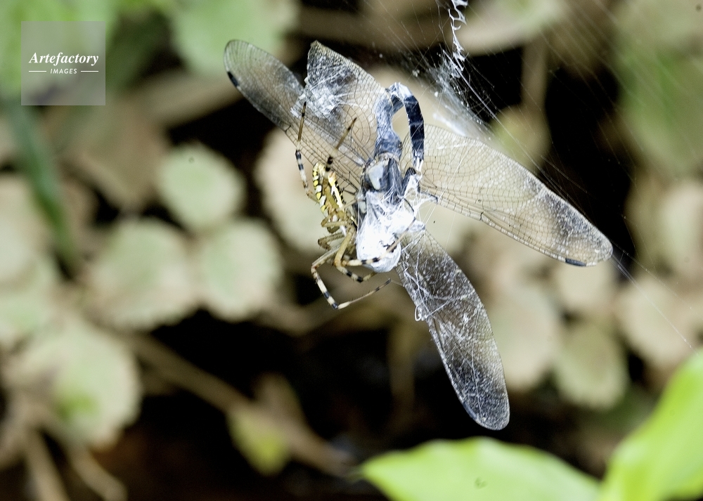 | キャプション | ナガコガネグモがシオカラトンボを捕らえた 餌食 | 制限事項 | ||