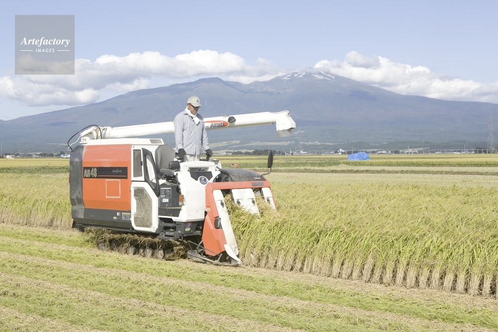 作品タイトル     庄内平野の稲刈り 後方鳥海山 モデルリリース なし