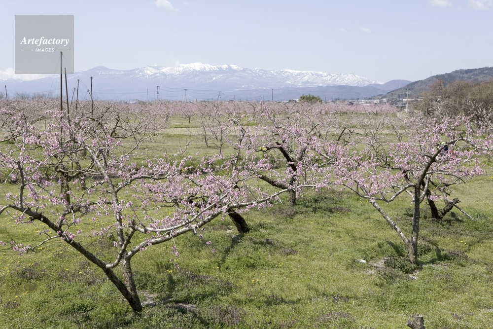 | 作品タイトル | 満開のモモ畑と吾妻連峰 | モデルリリース | なし | |