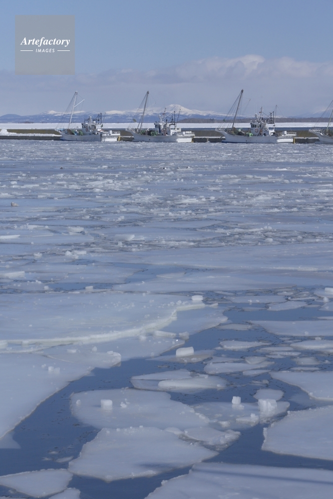 | 作品タイトル | 結氷した尾岱沼漁港と国後島(ホタテ漁船) | モデルリリース | なし | |