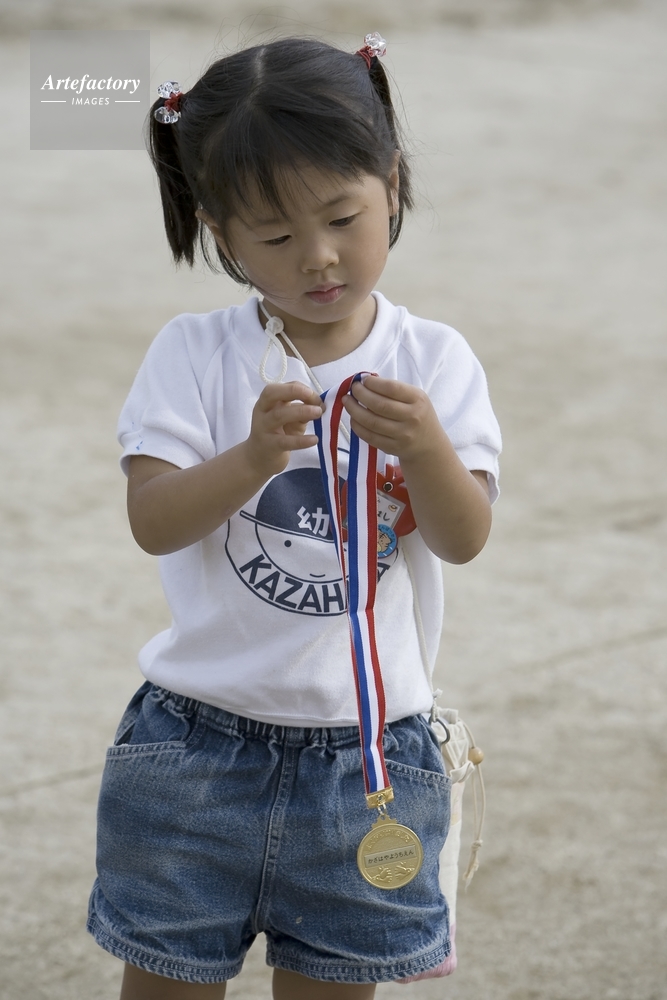 | 作品タイトル | 運動会参加記念、おもちゃの金メダルを持つ園児 | モデルリリース | あり | |