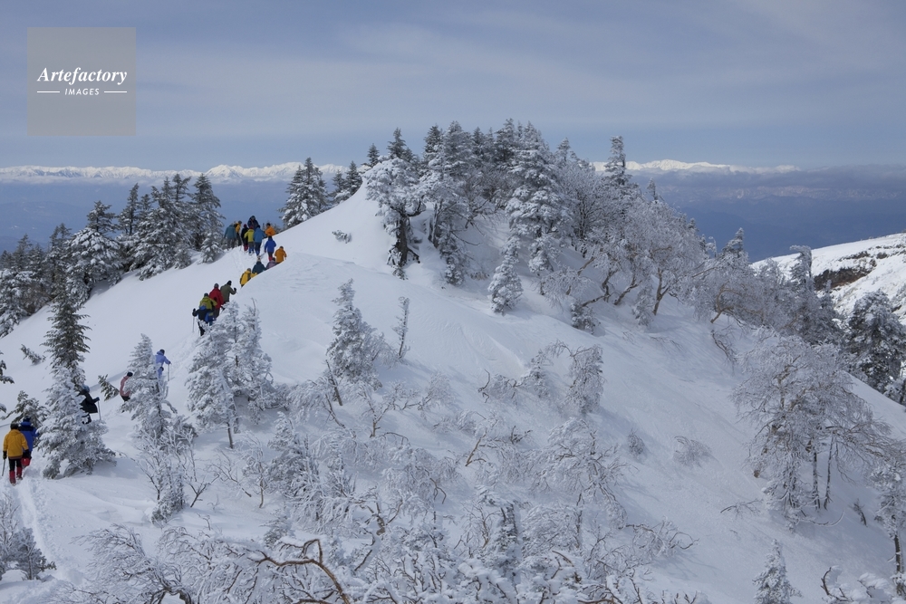 | 作品タイトル | 四阿山下山中に見た霧氷と北アルプス(遠方)の風景とパーティ | モデルリリース | なし | |