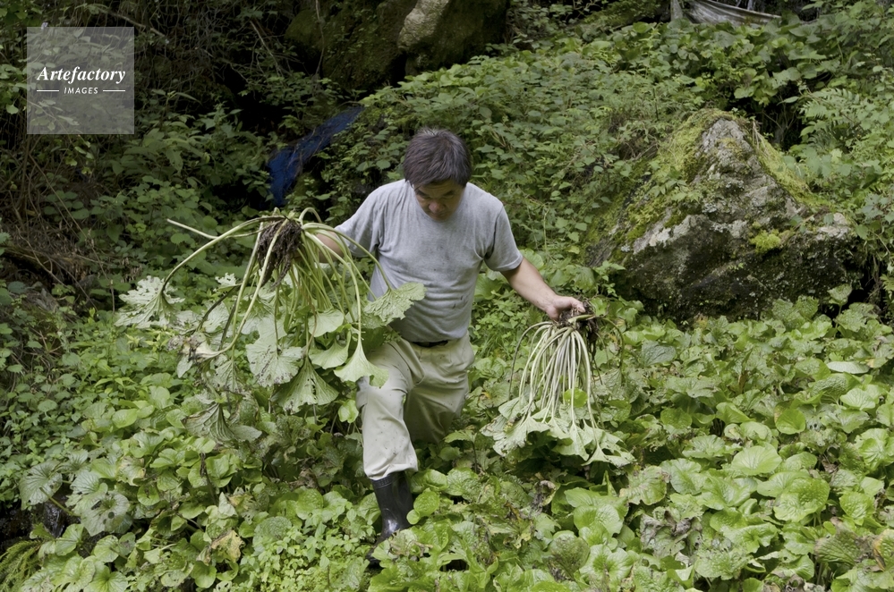| 作品タイトル | 奥多摩のワサビ田でワサビを収穫する農家男性 | モデルリリース | あり | |