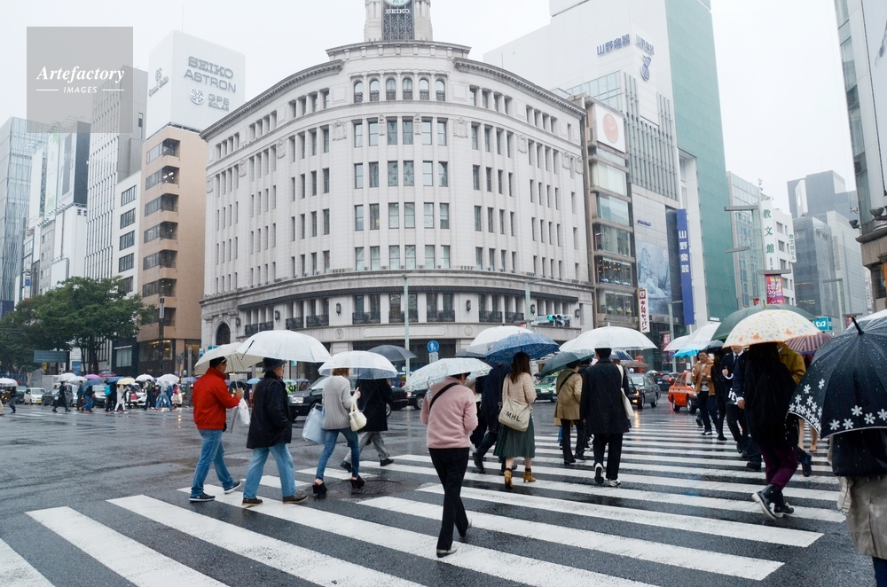 | キャプション | 傘をさして行かう人々、東京銀座4丁目交差点(東京都中央区)。 | 制限事項 | ||