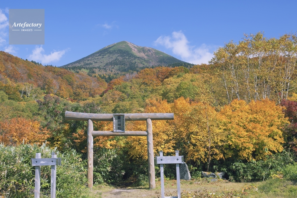 作品タイトル     黄葉の薬師神社と八甲田山 大岳 モデルリリース なし