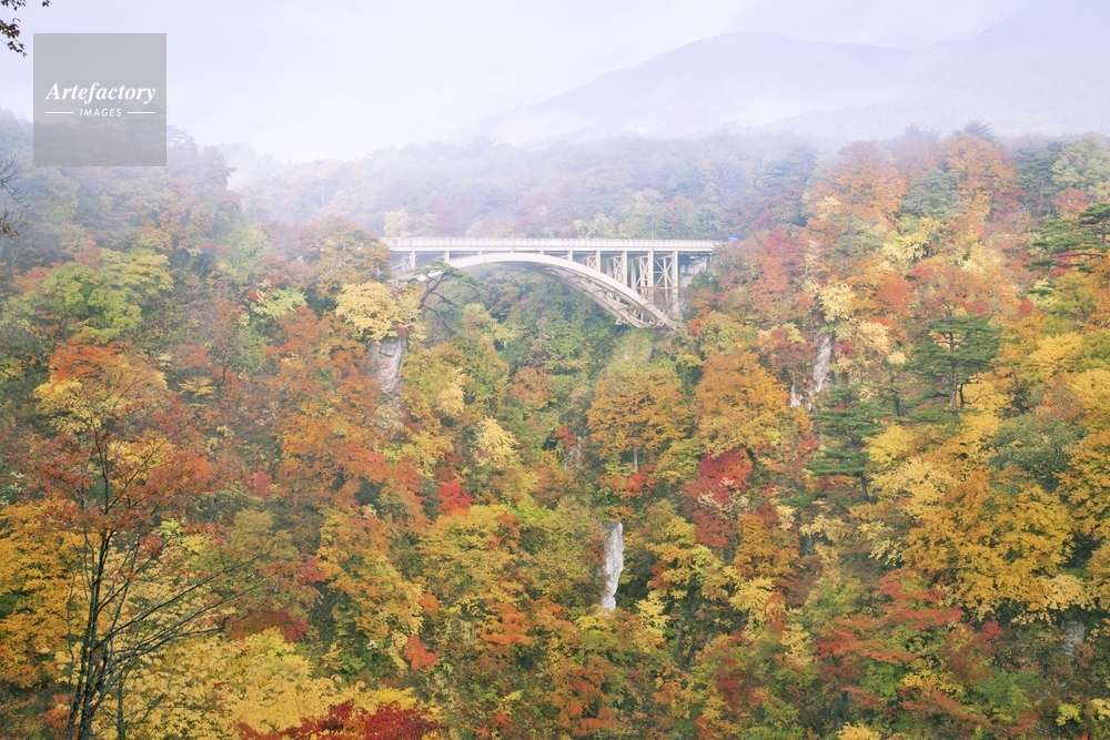 作品タイトル     紅葉の鳴子峡と大深沢橋朝霧 モデルリリース なし