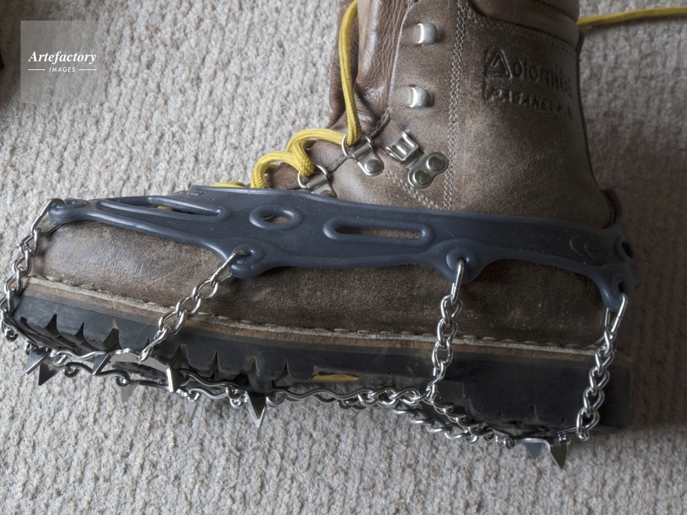 作品タイトル     チェーンスパイクと革製登山靴 モデルリリース なし