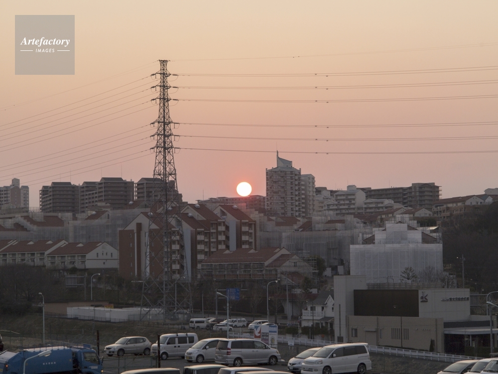 作品タイトル     沈み夕日とマンション群と駐車場と モデルリリース なし