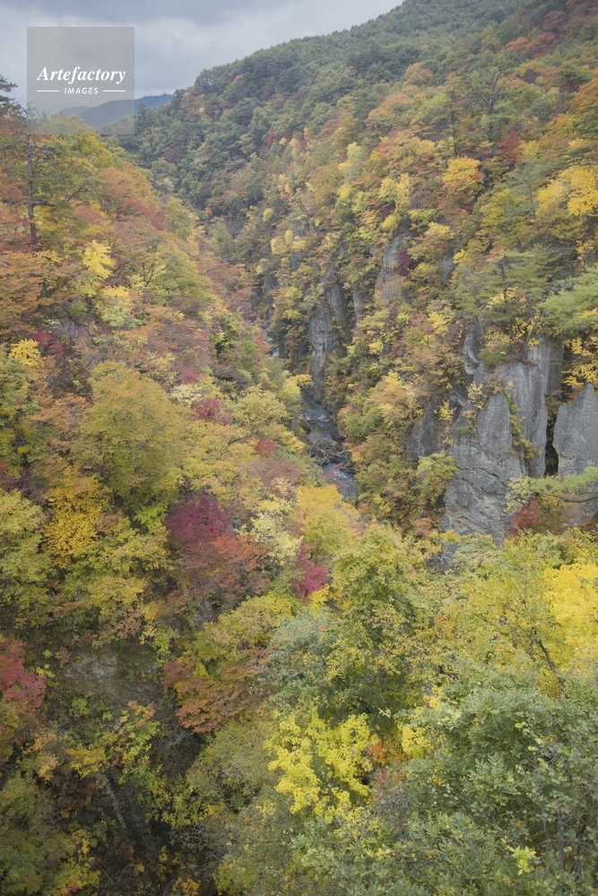 作品タイトル     鳴子峡の大深沢橋から眺める渓谷の紅葉 モデルリリース なし