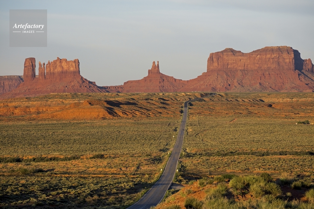| キャプション | 国道164と朝日に染まるモニュメントバレーの岩塔 | 制限事項 | ||