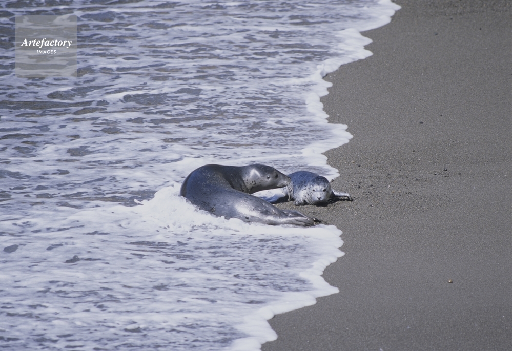 | キャプション | 親子 子供 波打ち際 2頭 砂浜 守る ゼニガタアザラシの仲間 | 制限事項 | ||