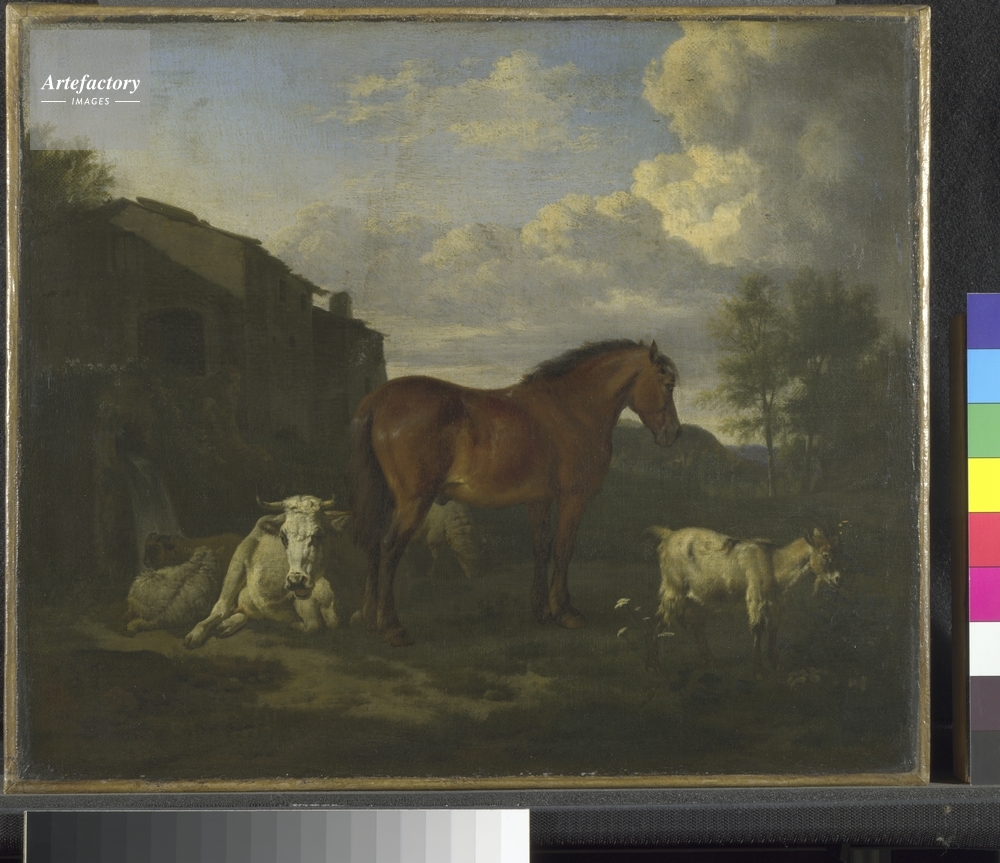 | 作品タイトル | A Bay Horse, a Cow, a Goat and Three Sheep near a Building | モデルリリース | なし | |