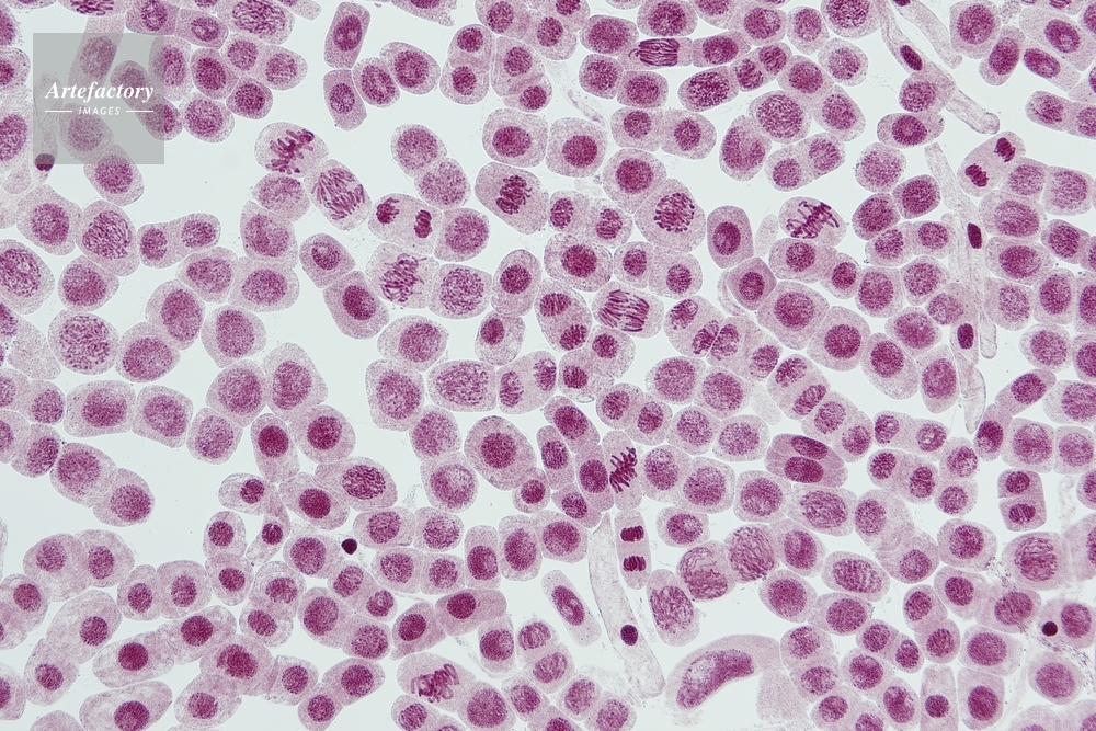 | キャプション | 体細胞分裂のいろいろな時期 酢酸オルセイン染色、長辺35mmの場合 50倍 | 制限事項 | ||
