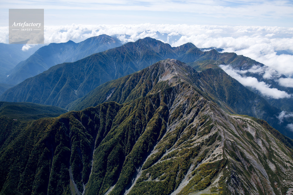 | 作品タイトル | 明石山脈(南アルプス)奥聖岳周辺より前聖岳,茶臼岳方面(南アルプス国立公園) | モデルリリース | なし | |