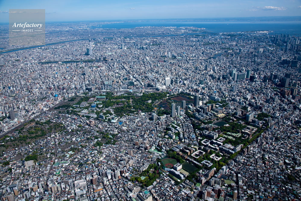 | 作品タイトル | 東京上野恩賜公園と上野駅より東京スカイツリー,東京湾方面 | モデルリリース | なし | |
