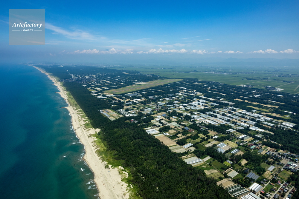 | 作品タイトル | 海岸の防風林と砂丘畑(花畑,果実,野菜畑と防風林)より庄内平野と庄内空港 | モデルリリース | なし | |