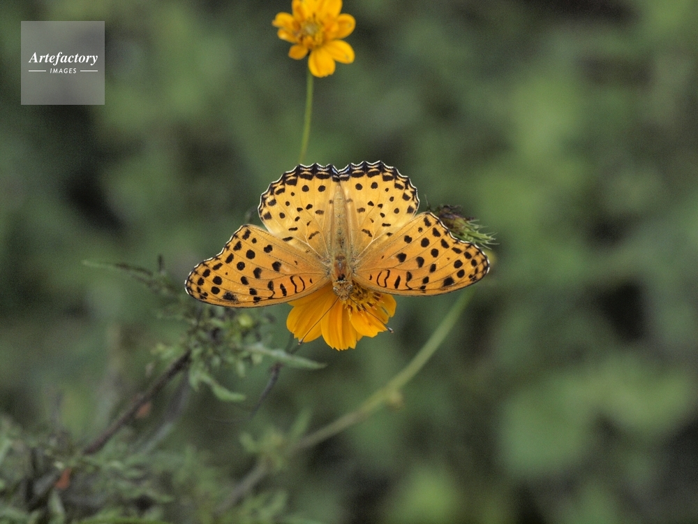 作品タイトル     ツマグロヒョウモン(オス)の吸蜜(キバナコスモス) モデルリリース なし