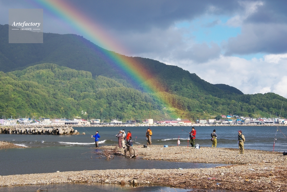 | 作品タイトル | 古平川の釣り人(サケ)と虹 | モデルリリース | なし | |