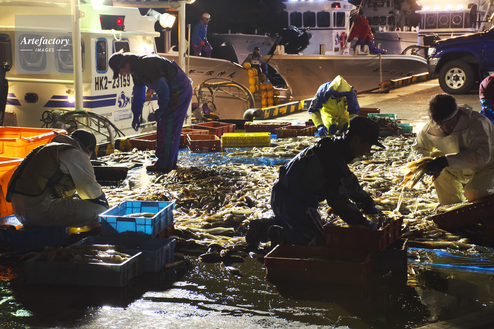 | 作品タイトル | 羅臼港のイカ荷揚げとイカ選別 | モデルリリース | なし | |