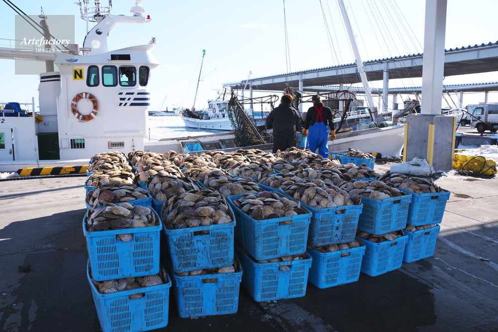| 作品タイトル | 尾岱沼漁港のホタテの荷揚げとホタテ漁船 | モデルリリース | なし | |