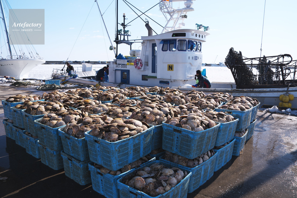 | 作品タイトル | 尾岱沼漁港のホタテの荷揚げとホタテ漁船 | モデルリリース | なし | |