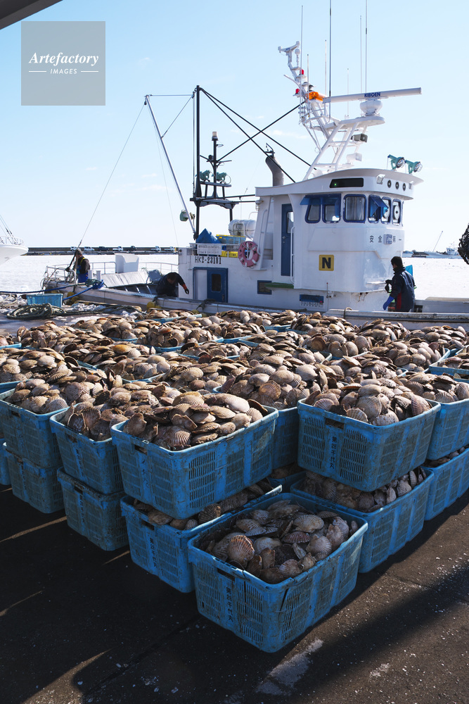| 作品タイトル | 尾岱沼漁港のホタテの荷揚げとホタテ漁船 | モデルリリース | なし | |