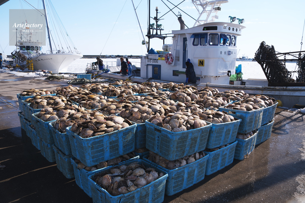 | 作品タイトル | 尾岱沼漁港のホタテの荷揚げとホタテ漁船 | モデルリリース | なし | |